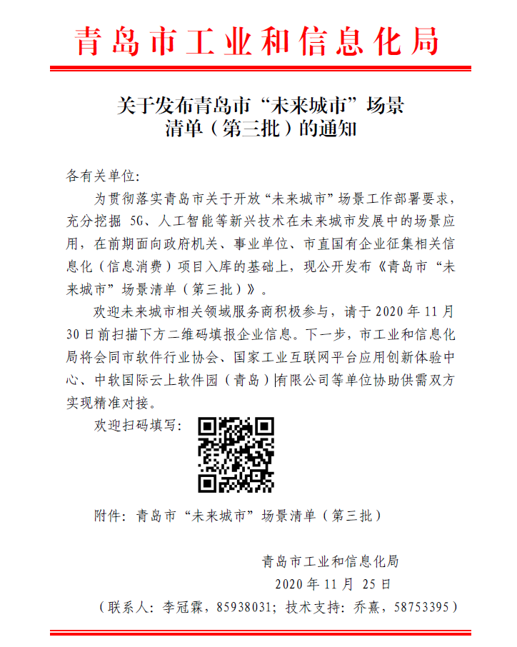 为贯彻落实青岛市关于开放“未来城市”场景工作部署要求,充分挖掘5G、人工智能等新兴技术在未来城市发展中的场景应用,在前期面向政府机关、事业单位、市直国有企业征集相关信息化(信息消费)项目入库的基础上,现公开发布《青岛市“未来城市”场景清单(第三批)》。欢迎未来城市相关领域服务商积极参与,请于2020 年11 月30 日前扫描下方二维码填报企业信息。下一步,市工业和信息化局将会同市软件行业协会、国家工业互联网平台应用创新体验中心、中软国际云上软件园(青岛)有限公司等单位协助供需双方实现精准对接。